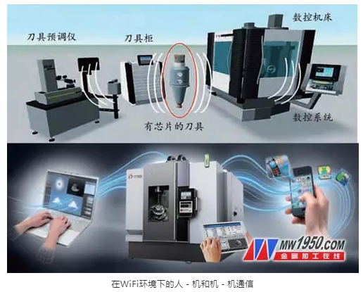 從圖中可見(jiàn),不僅人機(jī)的交互方式從控制面板延伸到移動(dòng)終端,設(shè)備和工具之間也可以進(jìn)行物與物的通信。機(jī)床的加工精度和效率在很大程度上取決于刀具的狀態(tài),如果在刀具或刀柄上嵌入芯片,就成為智能刀具。芯片不僅可以記錄在刀具預(yù)調(diào)儀上進(jìn)行調(diào)整時(shí)的數(shù)據(jù),還可以記錄刀具在機(jī)床進(jìn)行了多長(zhǎng)的切削時(shí)間,還有多少剩余壽命,可以加工幾個(gè)零件等都可以讓操作者和有關(guān)部門(mén)了如指掌,減少停機(jī)和更換刀具的時(shí)間。智能刀具及其管理的概念如上圖所示。