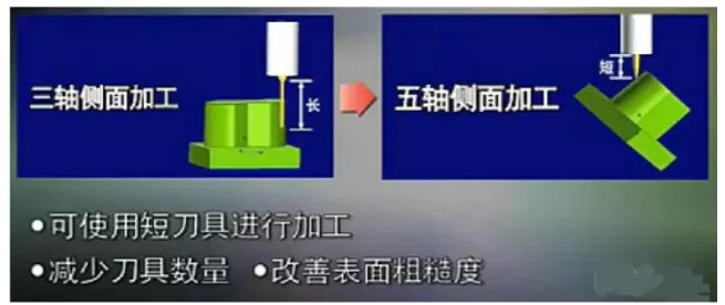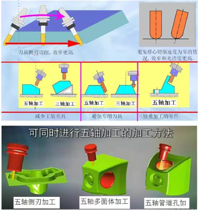 與三軸聯(lián)動(dòng)的數(shù)控加工相比,從工藝和編程的角度來(lái)看,對(duì)復(fù)雜曲面采用五軸數(shù)控加工有以下優(yōu)點(diǎn):