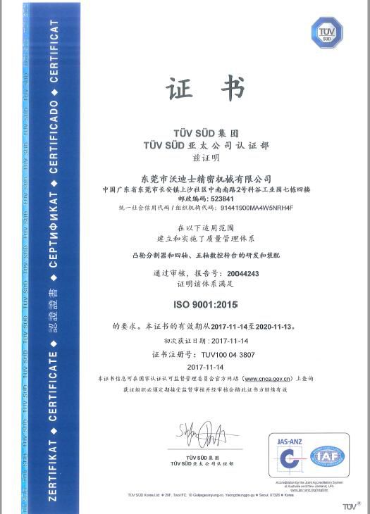 近日沃迪士在"凸輪分割器和四軸、五軸的研發(fā)和裝配”的質(zhì)量管理上的有效性通過了國際權(quán)威認證機構(gòu)南德TUV SUD第二階段的嚴格審廠,獲得了ISO9001:2015 證書。